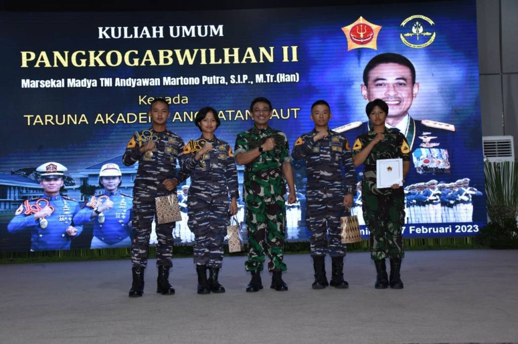 Surabaya/Harian Online News-Panglima Komando Gabungan Wilayah Pertahanan (Pangkogabwilhan) II Marsdya TNI Andyawan Martono P. berikan kuliah umum kepada empat ratus dua puluh Taruna Akademi Angkatan Laut (AAL), dengan tema “Pembentukan Karakter Pemimpin Yang Profesional”, bertempat di Gedung Maspardi, Kesatrian AAL, Bumimoro, Surabaya, Selasa (7/2).