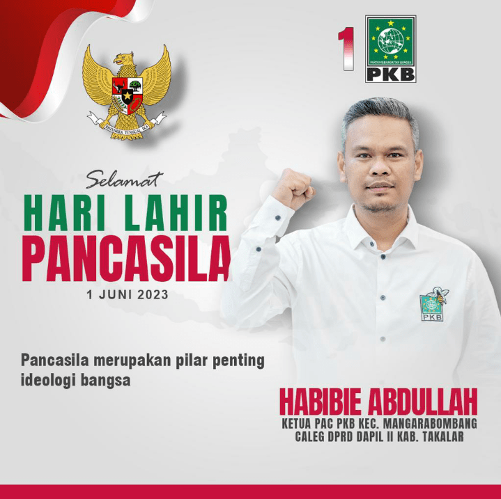 Dengan Jiwa Semangat Peringatan Hari Lahir Pancasila Dalam momentum tersebut,Habibie Abdullah Ketua PAC PKB Kecamatan Mangarabombang Caleg Dapil 2 Takalar Kabupaten Takalar dengan semangat Mengucapkan Selamat Hari Lahir Pancasila 1 Juni 2023