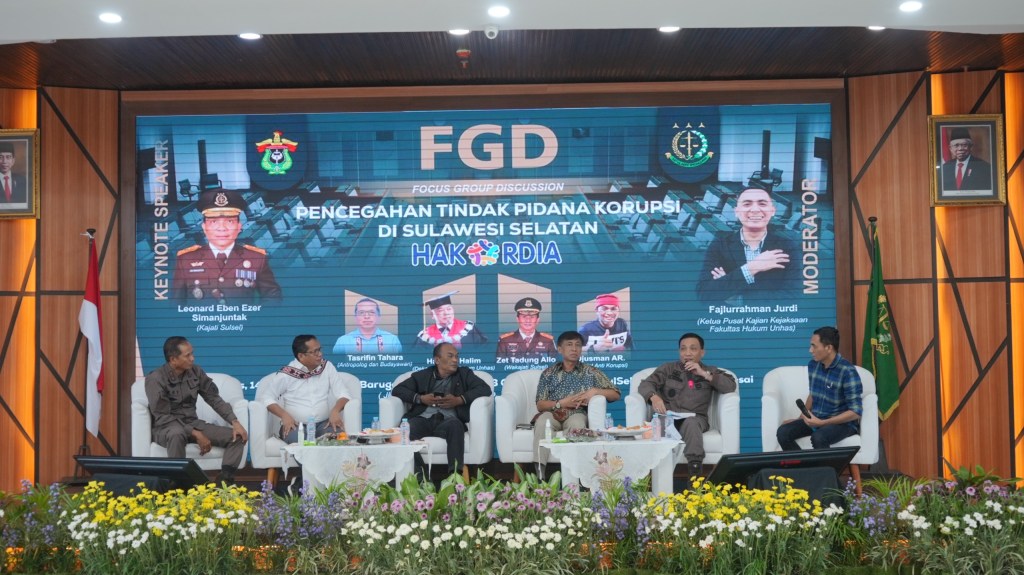 Kegiatan Forum Grup Discussion (FGD) dilaksanakan secara luring dan secara during diikuti oleh seluruh Kejaksaan Negeri dan Cabang Kejaksaan Negeri se Sulawesi Selatan. Adapun pembicara/nara sumber FGD yaitu Wakajati SulSel Zet Tadung Allo, SH.MH, Kepala Departemen Antropologi Fakakultas Ilmu Sosial Ilmu Politik Universsitas Hasanuddin Tasrifin Tahara, Prof. Irwansyah dan Bang Djusman AR (Penggiat Anti Korupsi di Sulawesi Selatan).