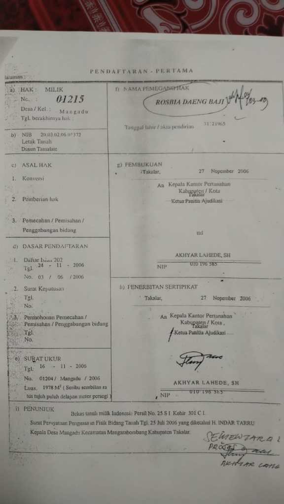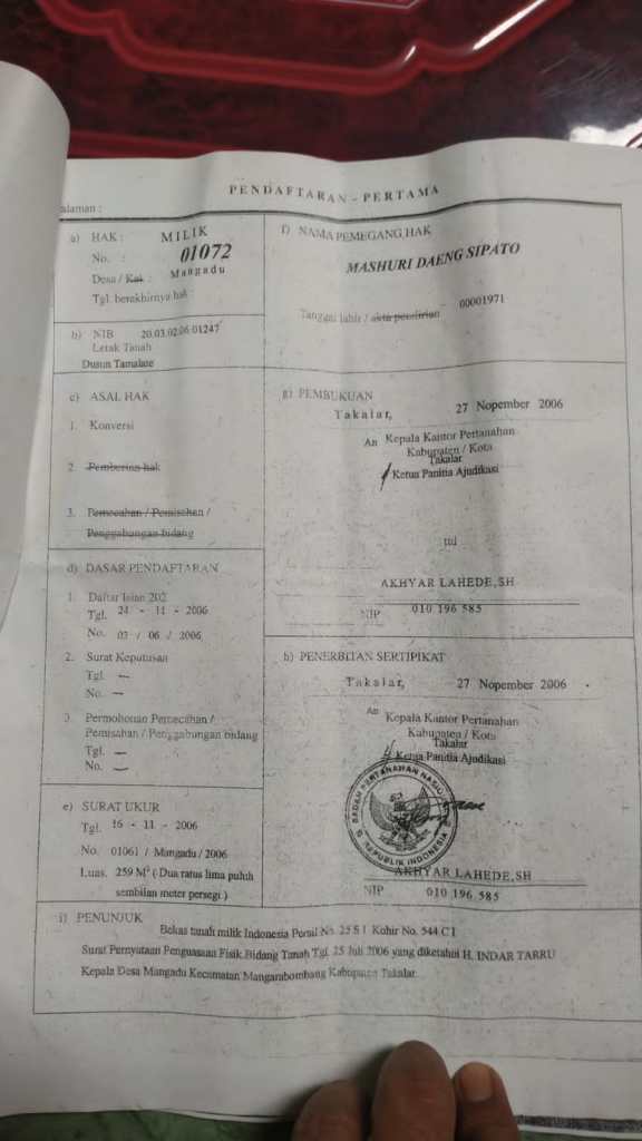 Kepada Media Selasa (02/01/2024) Rosbia Dg.Baji menyampaikan bahwa sebidang tanah tanahnya miliknya yang bersetifikat dengan luas 1978 Meter persegi dan berbatasan dengan tanah milik Mashuri Daeng Sipato, telah ikut terjual tanpa sepengetahuaannya, kuat dugaan si penjual Mashuri Daeng Sipato yang telah melakukan penjualan dan melewati batas tanah disampingnya, hingga ukuran yang di jual oleh Mashuri daeng sipato melewati batas tanah miliknya, ” mengenai hal ini saya bermohon kepada Pemerintah Kelurahan dan kecamatan agar bisa di mediasi demi solusi yang terbaik”, paparnya.