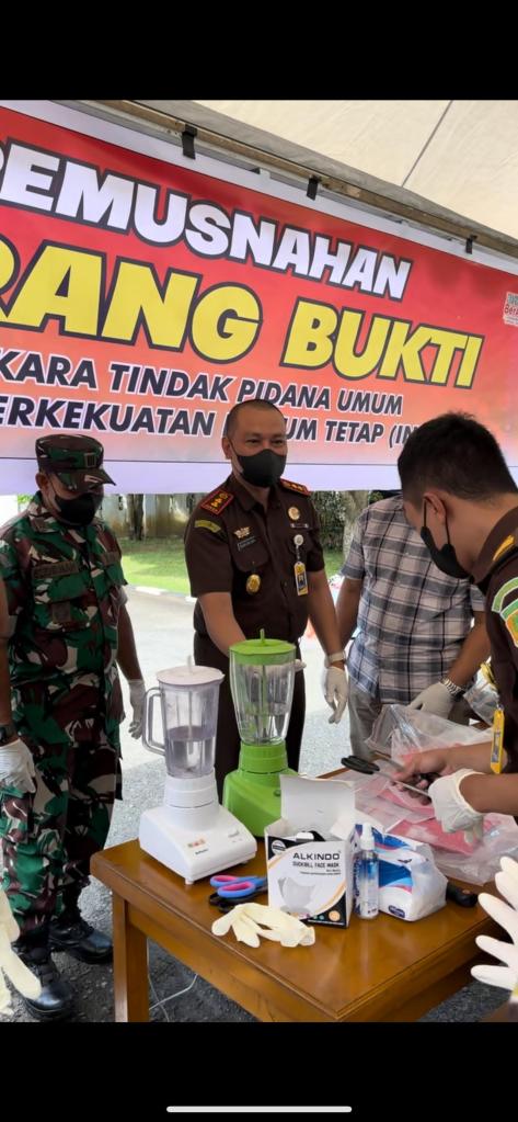 Lanjut menyampaikan bahwa pemusnahan barang Bukti berdasarkan putusan yang telah memperoleh kekuatan Hukum Tetap dimana barang bukti diperintahkan hakim dalam amar putusannya untuk dirampas untuk dimusnahkan., kegiatan pemusnahan barang bukti adalah dari berbagai perkara antara lain seperti narkotika Jenis Shabu total 11,8402 gram (61 Shacet), Bong (alat hisap),3 buah, Sachet Kosong 3 buah, Sachet Bekas Pakai : 4 buah, Pipet (sendok sabu) : 10 buah, Pireks, 3 buah, Pembungkus Rokok 4 buah, Ganja 3 bungkus, Senjata Tajam Parang 2 buah, Badik, 1 buah, Obat-Obatan, THD 89 tablet, Handphone 5 buah, ” tegasnya