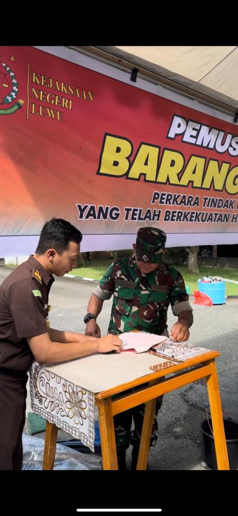 Sebelum pemushanan BB, diadakan penandatangan berita acara Pemusnahan Barang Bukti Perkara Tindak Pidana Umum yang telah berkekuatan Hukum Tetap (Inkracht) oleh Kepala Kejaksaan Negeri Luwu, Kapolres Luwu diwakili oleh Kabag Ops Reskrim, Dandim diwakili oleh Danramil Belopa, Kepala Seksi Pengelolaan Barang Bukti dan Barang Rampasan dan Kepala Seksi Tindak Pidana Umum Kejaksaan Negeri Luwu.