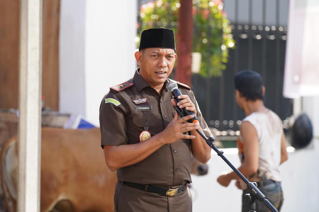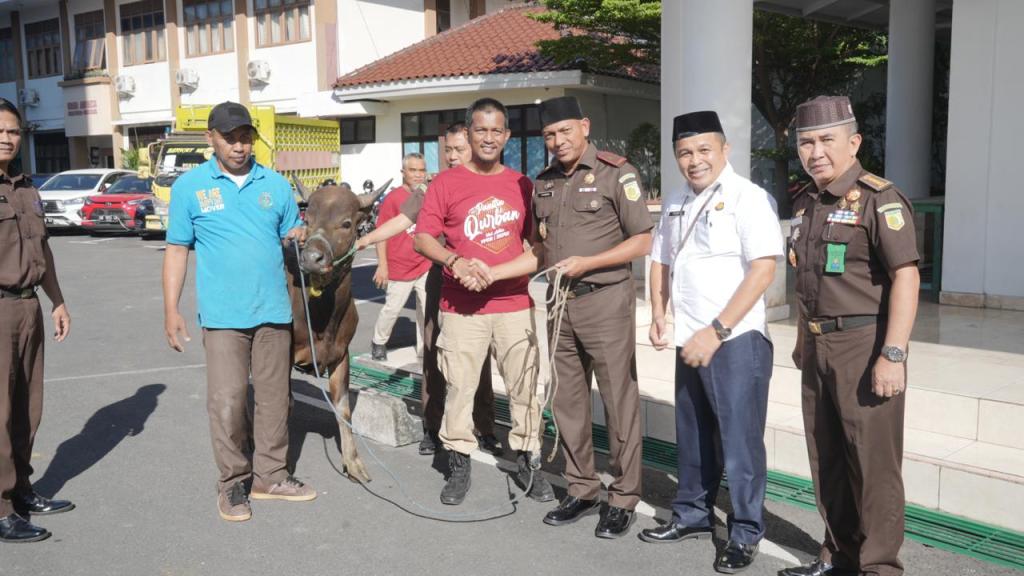 Rabu (17/06/2024) Bertempat di halaman Masjid Baitul Adli Kejaksaan Tinggi Sulawesi selatan, Wakil Kepala Kejaksaan Tinggi Sulawesi Selatan Dr. Teuku Rahman, S.H., M.H. didampingi Asdatun selaku Ketua DKM Masjid Baitul Adli Kejati Sulsel Feri Tas SH. M.Hum. M.Si. menyerahkan secara simbolis hewan kurban kepada Aspidmil Kejati Sulsel selaku ketua Panitia Penyembelihan dan Pembagian Qurban Kejati Sulsel Dr. M. Asri Arief, SH., M.Si, CTMP. Penyerahan dan Penyembelihan Hewan Qurban dilaksanakan dalam rangka merayakan Hari Raya Idul Adha 1445 H/2024 M,