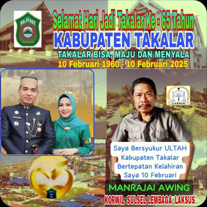 Selamat Hari Jadi Takalar Ke-65 Ditulis olehabanggjul8 Feb 2025Diposkan padaNews, Ucapan SelamatTag:10 Februari 1960 - 10 Februari 2025, Selamat Hari Jadi Takalar Ke - 65 Tahun, Sulawesi Selatan, Takalar 10 Februari 1960 – 10 Februari 2025 SHARE Bagikan pada Facebook(Membuka di jendela yang baru) Facebook Bagikan ke X(Membuka di jendela yang baru) X Bagikan ke Telegram(Membuka di jendela yang baru) Telegram Bagikan ke WhatsApp(Membuka di jendela yang baru) WhatsApp Terkait