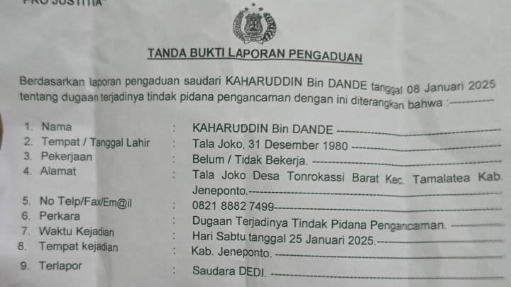 Jeneponto, 14 Maret 2025 — Kaharuddin Bin Dande, warga Kabupaten Jeneponto, melaporkan dugaan tindak pidana pengancaman yang diduga dilakukan oleh seorang pria bernama Dedi pada 8 Januari 2025. Meski laporan telah disampaikan, peristiwa pengancaman yang dialami Kaharuddin diklaim terjadi jauh sebelumnya, pada 25 Januari 2025. Namun, hingga kini, ia merasa proses hukum terhadap pelaku berjalan lambat dan merasa khawatir akan keselamatannya.