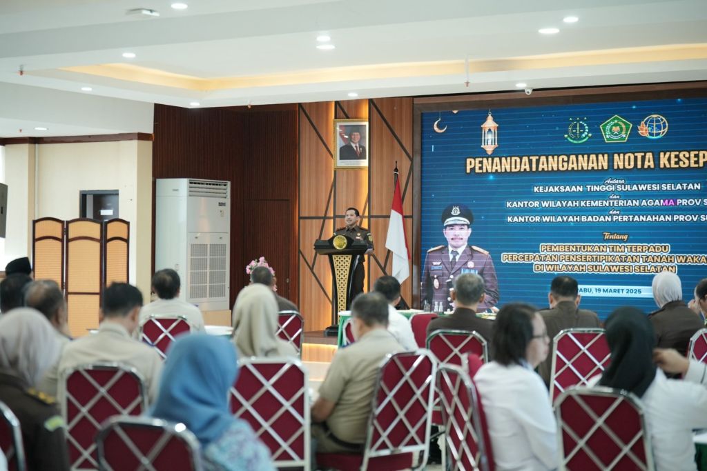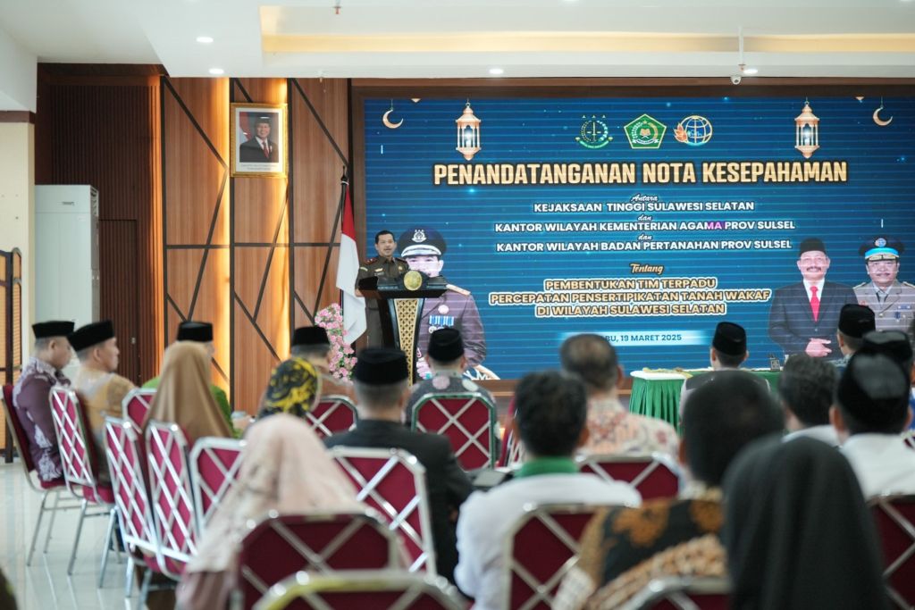 KEJATI SULSEL, Makassar— Kejaksaan Tinggi Sulawesi Selatan Bersama Kantor Wilayah Kementerian Agama Provinsi Sulawesi Selatan dan Kantor Wilayah Badan Pertanahan Nasional Provinsi Sulawesi Selatan menggelar penandatanganan nota kesapahaman (MoU) tentang pembentukan Tim Terpadu Percepatan Pensertipikatan Tanah Wakaf di Wilayah Sulawesi Selatan di Aula Kejati Sulsel, Rabu (19/3/2025).