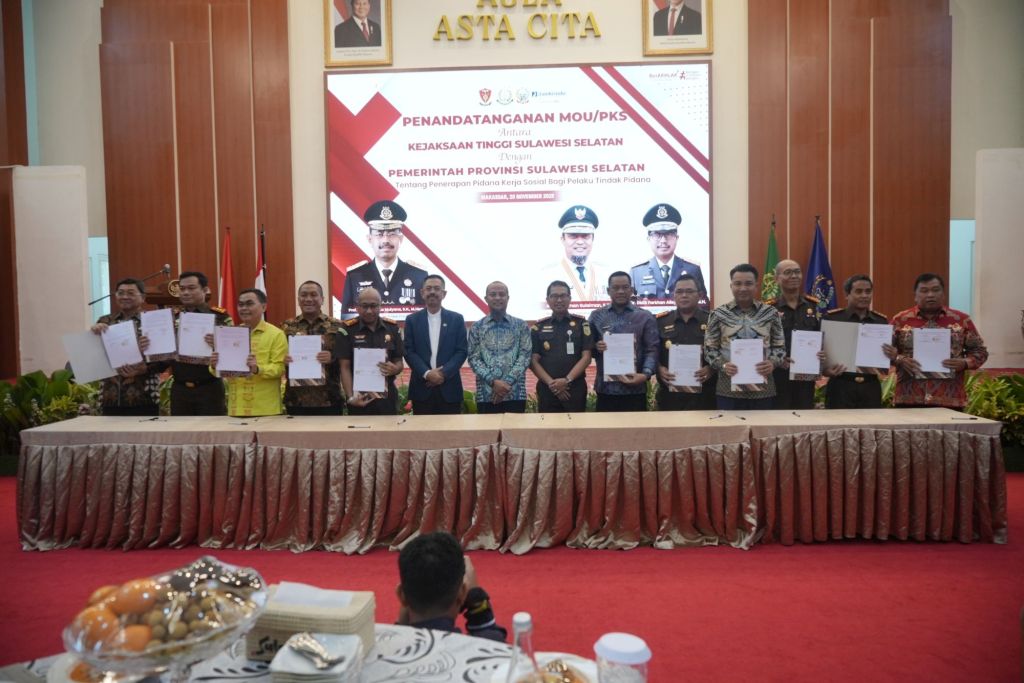 Haŕianonline.news-Beritaterkini,KEJATI SULSEL, Makassar – Kejaksaan Tinggi Sulawesi Selatan (Kejati Sulsel) bersama Pemerintah Provinsi Sulawesi Selatan (Pemprov Sulsel) melakukan penandatangan Nota Kesepahaman (MoU) tentang penerapan pidana kerja sosial (Social Service Order) bagi pelaku tindak pidana di Baruga Asta Cita, Rumah Jabatan Gubernur Sulawesi Selatan, Kamis (20/11/2025).